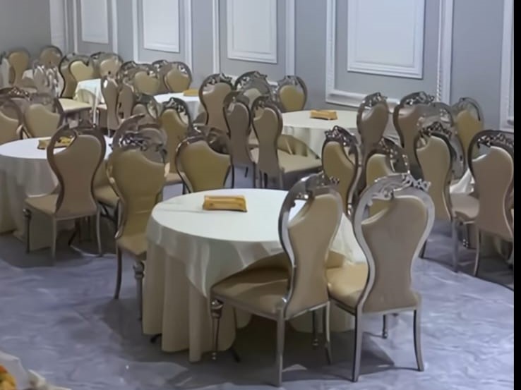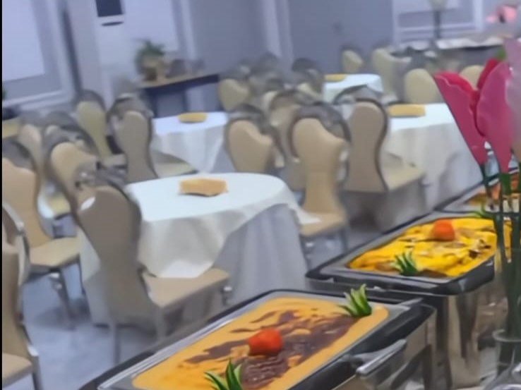 - صالة الطعام: هي مستقلة تماماً. تتسع لـ 800 ضيف. نحن نرتبها بطاولات وكراسي مريحة. كما نجهزها بكامل تجهيزات الضيافة.