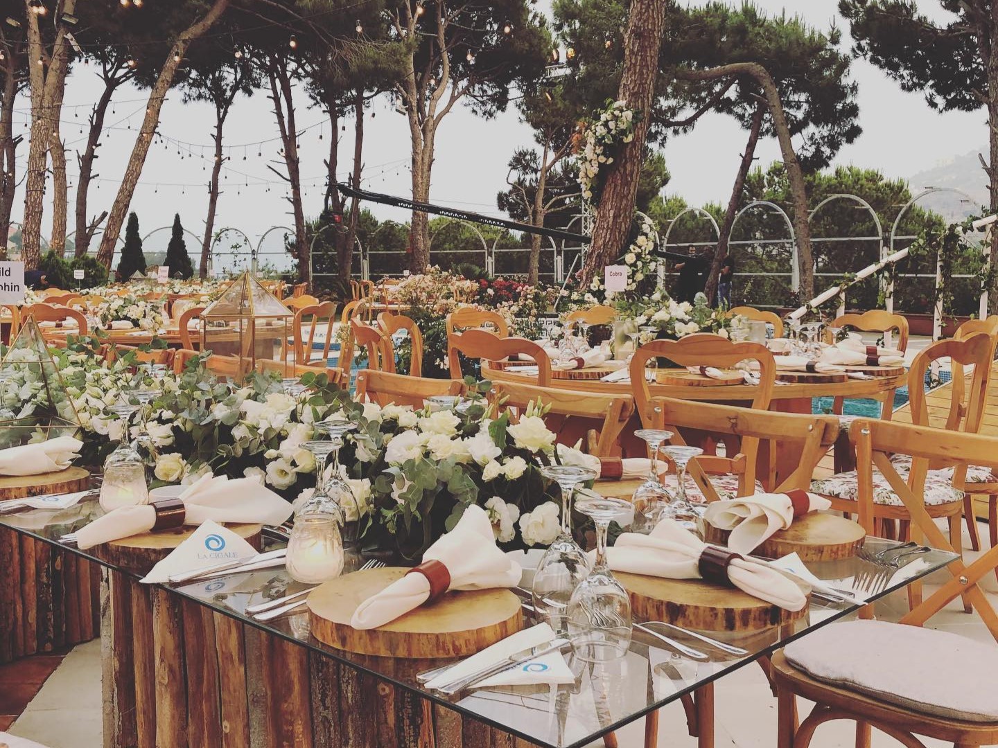 القاعة الخارجية مصممة لتندمج مع المشهد الطبيعي المحيط، حيث أشجار الصنوبر العالية، الزهور المتنوعة بألوانها، والشلال الطبيعي مع بركة السباحة اللي بيضيفوا أجواء راقية ومثالية لحفلات الزفاف المفتوحة والمناسبات الاجتماعية المميزة.