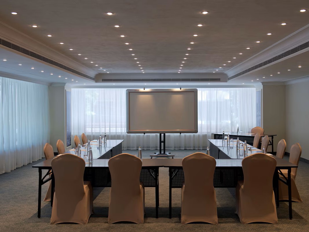 السعة بتوصل لحدود 200 شخص، مع إمكانية ترتيب الجلسات حسب طبيعة الاجتماع، سواء اجتماعات مجلس إدارة، ورش عمل، أو تدريبات. الفندق يتميّز بكونه الوحيد في بيروت اللي بيقدّم شاشات LG TR3DK التفاعلية بقياس 86 بوصة، ما بيعطي قيمة مضافة للعروض التقديمية والاجتماعات التفاعلية.