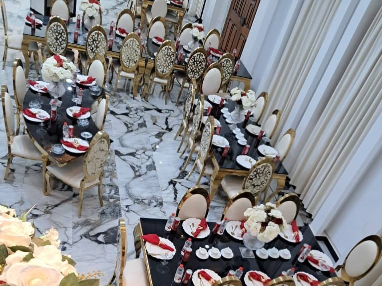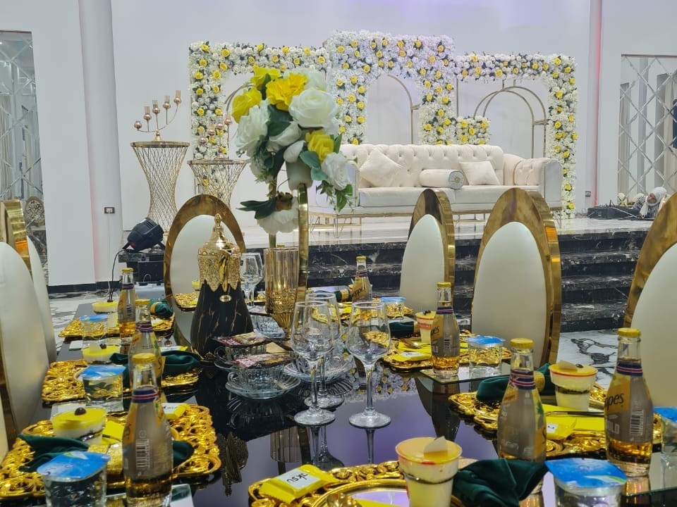- تنسيق كامل للحفل يشمل الطاولات، الكراسي، الديكورات، وباقات الورد.