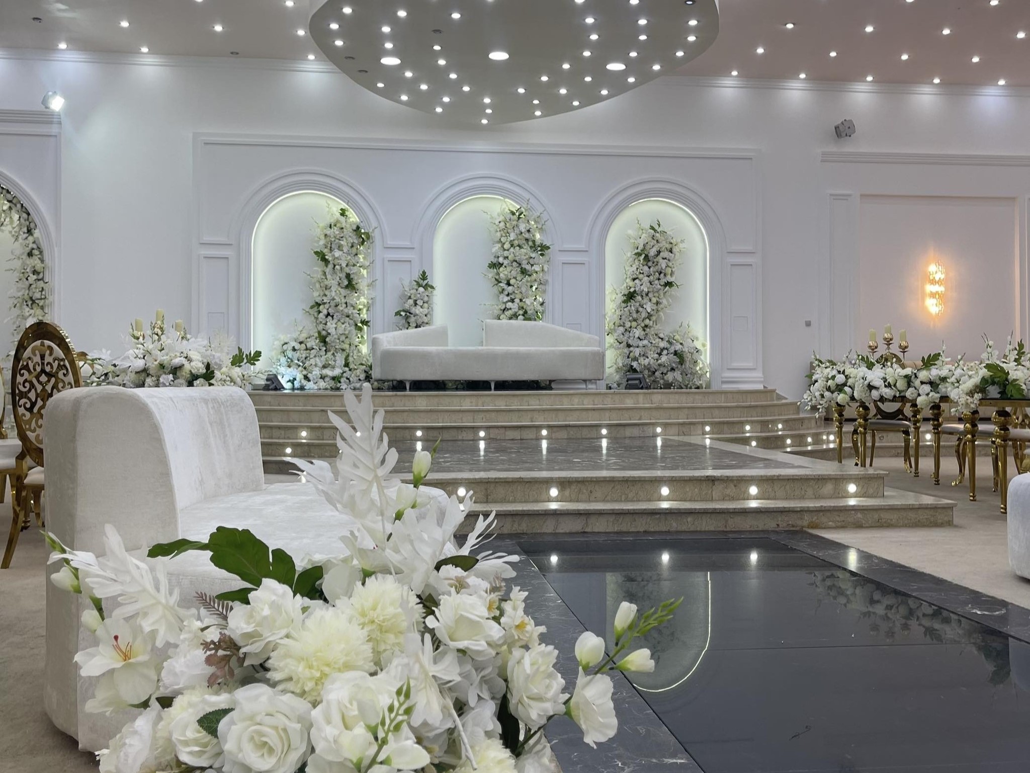 - أنظمة صوت وإضاءة حديثة قابلة للتهيئة حسب أجواء الحفل.