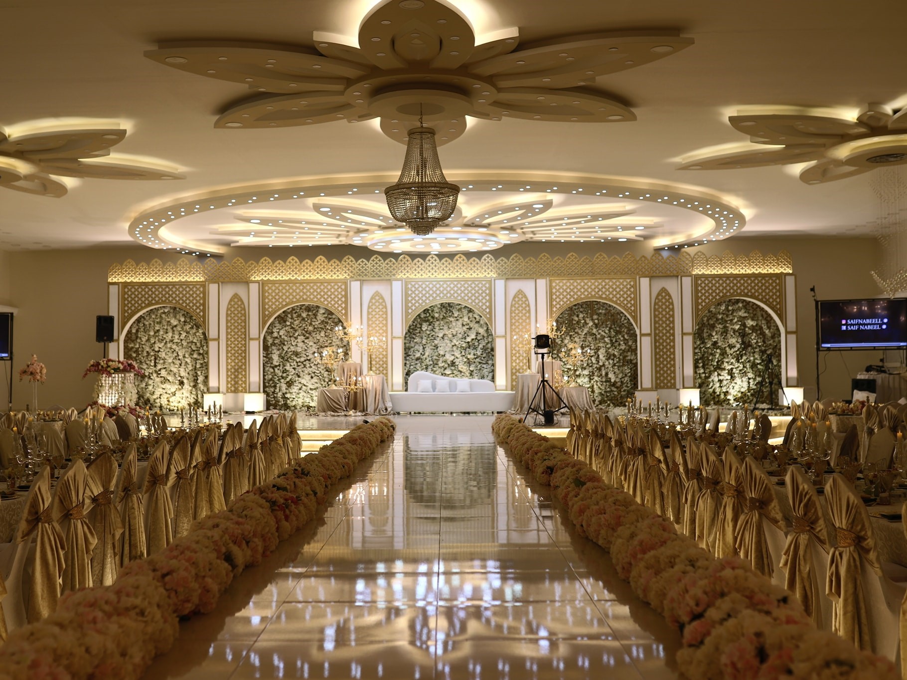 كما تتضمن القاعة نظام إضاءة متكامل وشاشات عرض حديثة تضيف لمسة من التميز لأجواء الحفل.