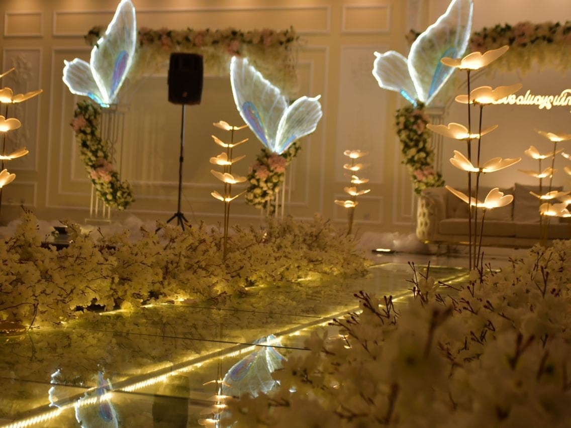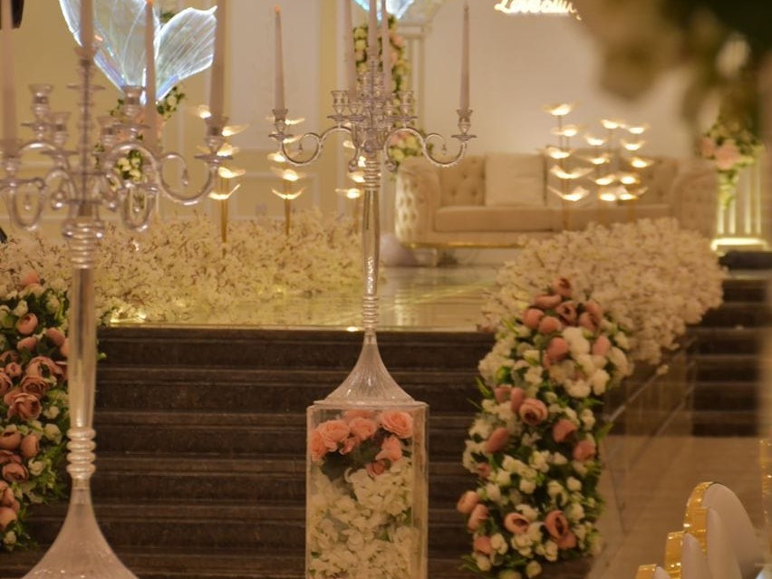 • ديكورات فاخرة تشمل المسرح والطاولات والكوشة بتصاميم عصرية قابلة للتخصيص