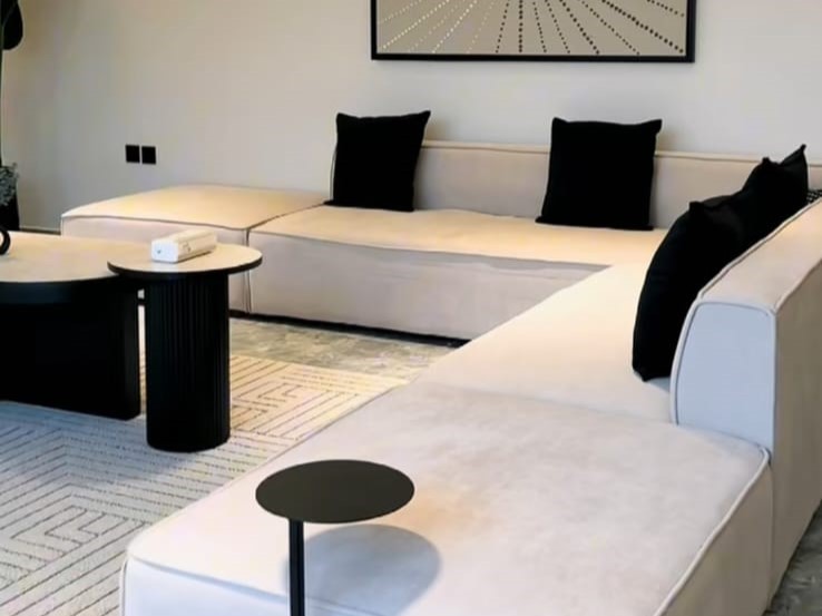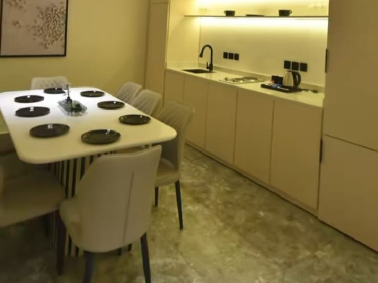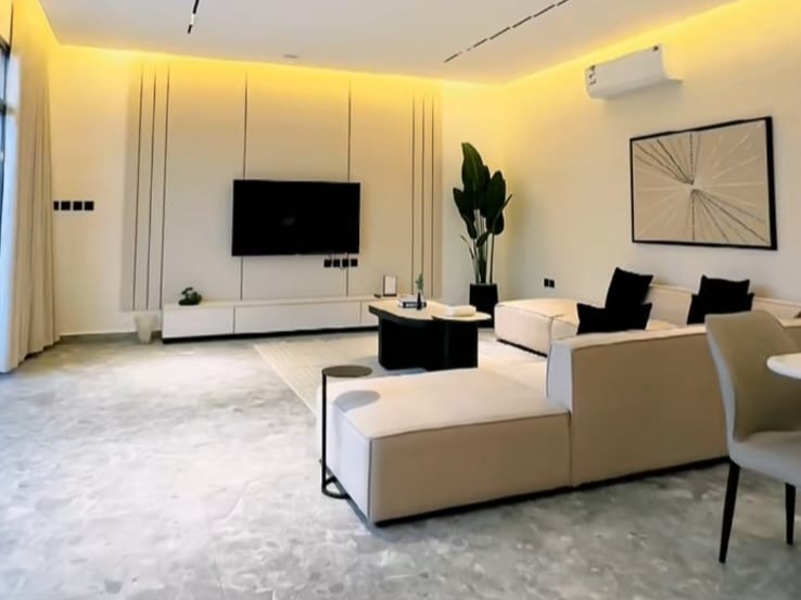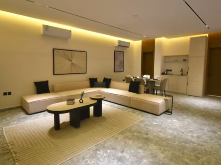 وصالة واسعة بإطلالة مباشرة على المسبح، سفرة طعام، أوفيس عملي، وغرفة نوم مهيأة للاسترخاء.