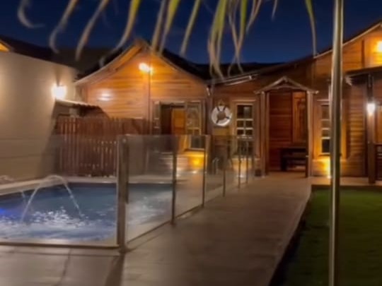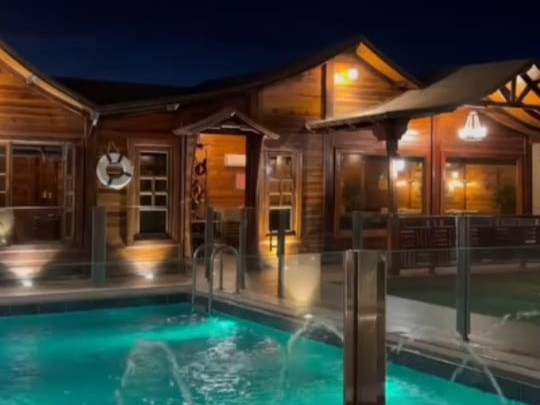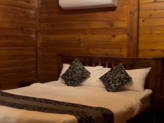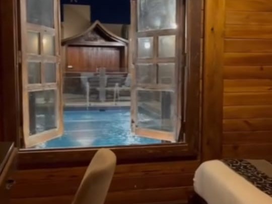 شاليه جميل فيه غرفة بسرير مريح، حمام مجهز، ومسبح خاص داخل الشاليه. المكان يوفر لك خصوصية تامة وخدمات راقية تخلّي تجربتك مختلفة.
