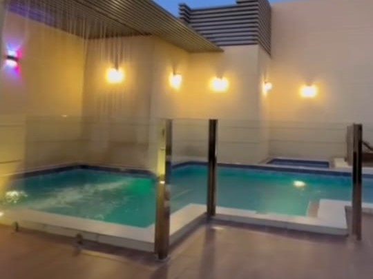 شاليه واسع فيه غرفة بسرير مريح، حمام أنيق، ومسبح داخلي خاص. المكان مثالي للراحة والاستجمام، مع خدمات متكاملة تضمن راحتك من أول لحظة.