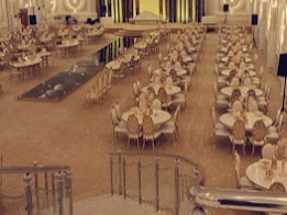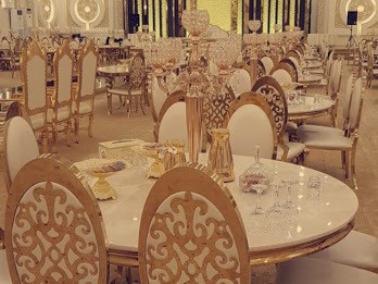 - التنسيق الداخلي: الطاولات مزينة بأفخم الإكسسوارات والكراسي الذهبية الجميلة، مع تنسيق منظم يضفي مزيداً من الأناقة والتميّز على القاعة.