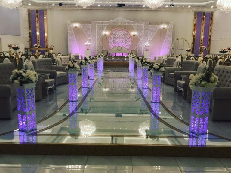 • كوشة العروس: مزينة بالأضواء والورود بطريقة احترافية، مع منصة خاصة للرقص تتمتع بإضاءة موزعة على الأرضيات لإضافة أجواء ساحرة وخلابة. ممر العروس مزين بالورود والأضواء الجميلة.