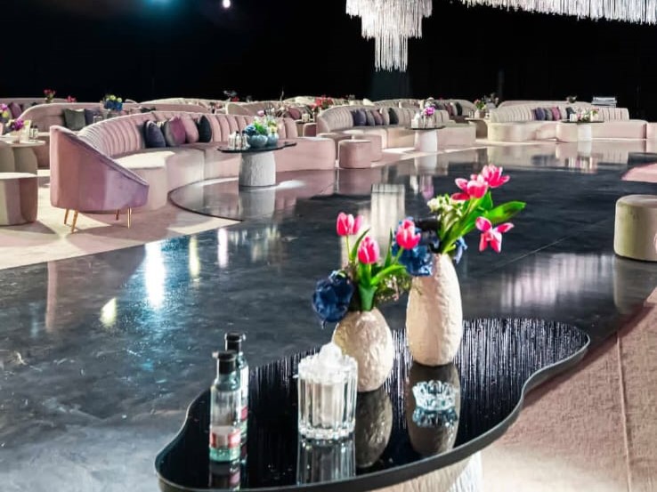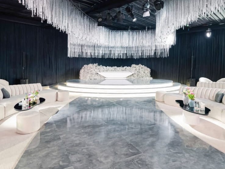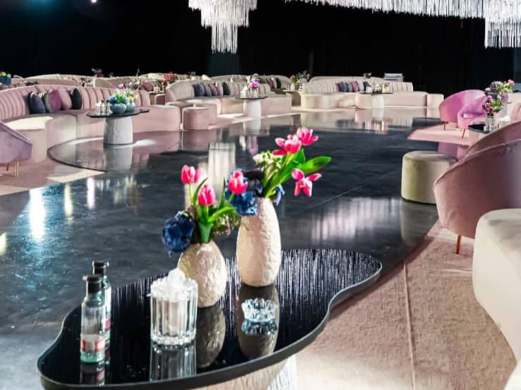 تصميم الفندق عصري وراقي، بأرضيات رخامية وأثاث متناسق يعطي طابع فخم، مع توزيع مرن للطاولات والكراسي بما يتناسب مع أسلوب الحفل.