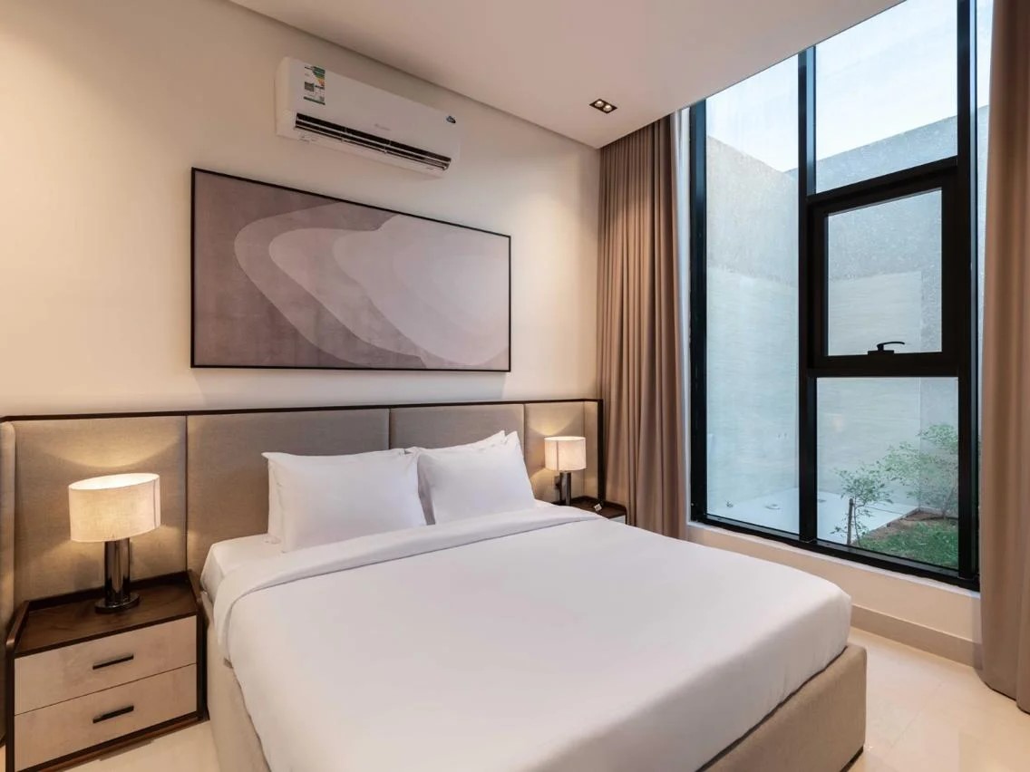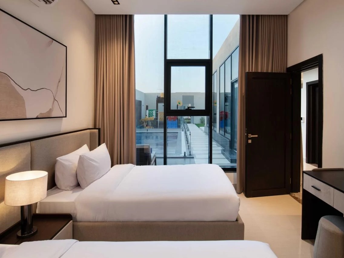 تضم غرفتين نوم فندقية (غرفة بسرير كينج وغرفة بسريرين توين)،