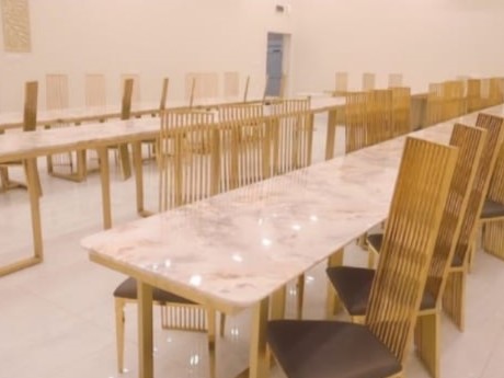قسم النساء عندنا يتسع لـ70 ضيفة، وعندكم 8 مضيفات متفرغات لراحتكم وخدمتكم. الضيافة عندنا كاملة، من قهوة سادة وعربية، عصاير طازجة، ونعناع منعش. كل طاولة VIP مزينة ببوكيهات ورد صناعي فخمة، وكوشة العروسة بتكون تحفة! وللعروسة جناح خاص كامل في الطابق العلوي فيه كل اللي تحتاجه.
