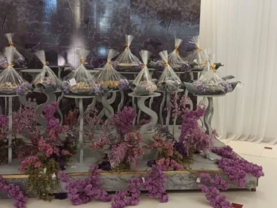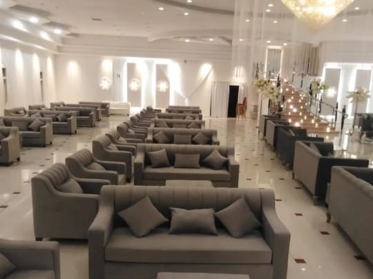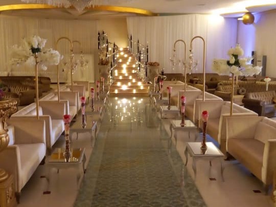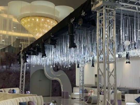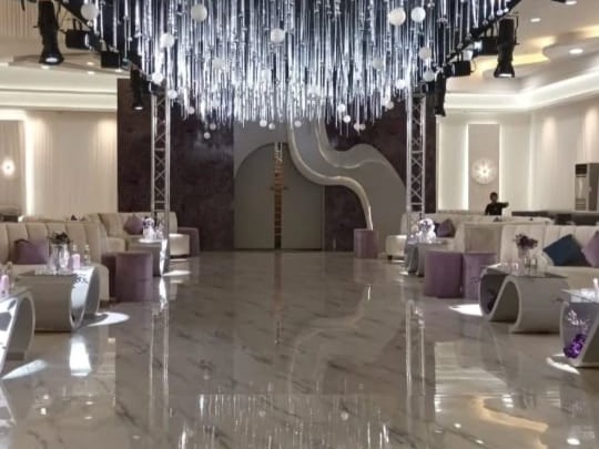 الديكورات عندنا تجنن! أسقف وجدران مزينة، أرضية رخامية، طاولات وكراسي فخمة، وممر زفة رخامي يلمع. الكوشة بتاعتنا في مسرح كبير، والإنارة كريستال وملونة تخلي المكان سحري!
