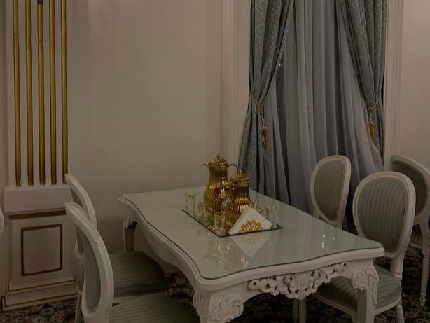 - تتميز القاعة بتصاميم ساحرة، حيث يحتوي السقف على زخارف عالية مطلية بألوان متناسقة، تضفي لمسة من الفخامة.