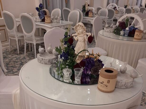 - القاعة مزودة بأثاث أنيق يتكون من طاولات مغطاة بأقمشة فخمة، وتزين الطاولات الفازات وأجمل الزهور.