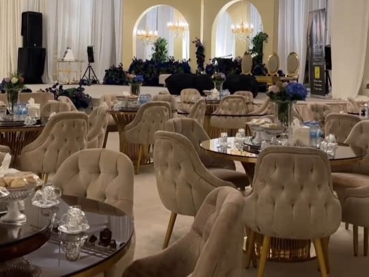 - ثريات كريستال فاخرة تضيء القاعة ببريق.