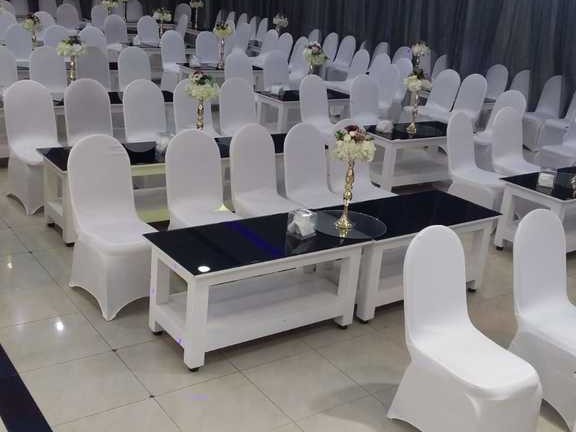 - علاوة على ذلك، لدينا أثاث فاخر. هو يشمل طاولات ضيافة، كنباً ملكياً، وطاولات دائرية مغطاة بأقمشة بيضاء أنيقة. كل هذا يضفي لمسة من الرقي على المكان.