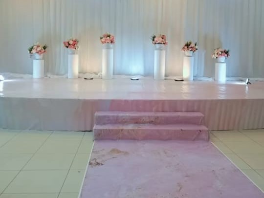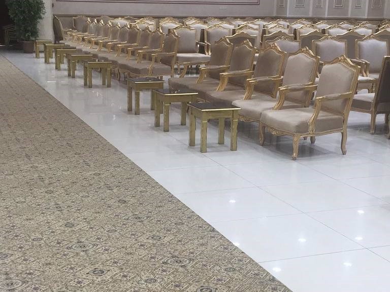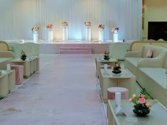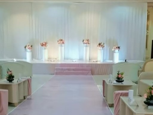 قاعة رحبة بتصاميم بيضاء راقية وأسقف عالية مزينة بالثريات الذهبية الكلاسيكية، مع أرضيات رخامية عاكسة للإضاءة. الممر الرخامي الخاص بالعرسان يزيد من روعة المشهد، محاط بأعمدة مضاءة تحمل باقات ورد بيضاء أنيقة. المسرح مجهز بأجمل موديلات الكوش، مع توزيع متناسق للطاولات والكراسي المغطاة بأقمشة فاخرة، وإكسسوارات تضيف لمسة ملكية على كل تفاصيل القاعة.