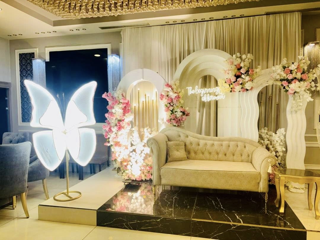 تصميم الصالة بسيط وأنيق، وقابل للتجهيز حسب نوع المناسبة، ليكون المكان جاهز يعكس فرحتكم ويكمّل أجواء الحدث بدون تعقيد.